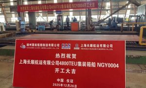 12月26日,扬州国裕造船厂区彩旗飘扬,上海长顺航运两艘4800TEU集装箱船NGY0003铺龙骨、NGY0004开工仪式同日隆重举行,海事...