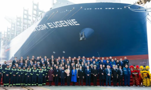 12月17日,江南造船(集团)有限责任公司为达飞海运集团建造的6艘“鲲”系列甲醇双燃料动力大型集装箱船第二艘船“CMA CGM EUGENI...