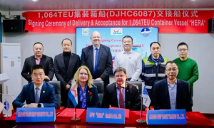 12月13日,由江苏省镇江船厂(集团)有限公司为韩国船东批量建造的430TEU集装箱船三号船——“HAKATA EXPRESS”完工交付,顺...
