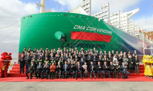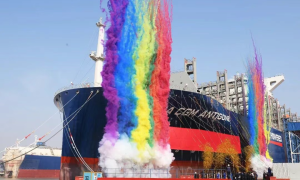 12月11日,江南造船(集团)有限责任公司为达飞海运集团建造的首艘“鲲”系列甲醇双燃料动力大型集装箱船首制船“CMA CGM ANTIGON...