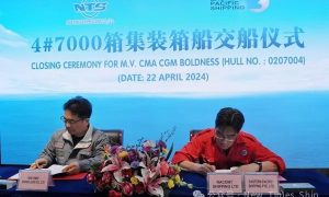 4月22日,新时代造船举行4#7000箱集装箱船——“CMA CGM BOLDNESS”号的交付仪式,常务副总经理张玉永与船东EPS代表倪杰...