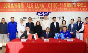 1月4日,由大连造船承接,山船重工负责为德国AL Maritime Holding建造的7100集装箱5号船ALS LUNA(月亮)号签字交...