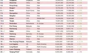 《劳氏日报》根据2014年各港口货物吞吐量数据统计,公布全球100大集装箱港口排行榜。 其中,前十强港口分别是:上海、新加坡、深圳、香港、宁...