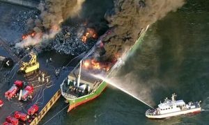 18日下午1420时,货船XIN ZHOU正在日本丰桥东岸装载废钢,突然大火从货舱熊熊燃起。 数量救火车以及日本海上保安厅派出的消防艇紧急赶...