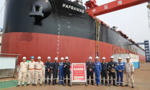 6月27日,扬州中远海运重工为希腊船东TMS Tankers 建造的5艘11.4万载重吨成品油船中第二艘船“DUNE”(船体号:N1160)...