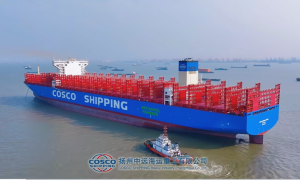 4月18日,扬州中远海运重工承建的国内首艘16000TEU甲醇双燃料集装箱船“中远海运洋浦(COSCO SHIPPING YANGPU)”轮...