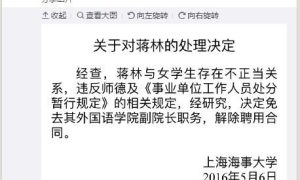 5月6日,上海海事大学官方微博发布了半个月前被传性侵女研究生林某的外语学院副院长蒋林的处理决定,称蒋林与女学生存在不正当关系,研究决定免去其...