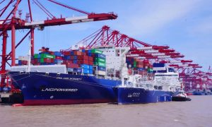 5月20日,在洋山港海事局船舶交通管理中心远程监控和拖轮现场警戒下,上海港保税LNG加注船“海港未来”轮完成“CMA CGM INTEGRI...