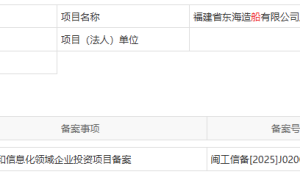 8月21日,福建省东海造船有限公司厂区提升船舶建造技改项目通过福安市工业和信息化局备案审批(备案号:闽工信备 (2025) J020058)...