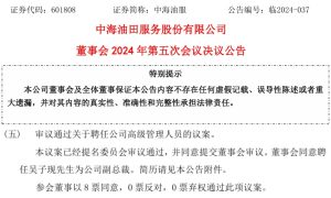 近日,中海油田服务股份有限公司(以下简称“中海油服”)发布《 董事会 2024 年第五次会议决议公告》,会议上审议通过聘任吴子现先生为中海油...