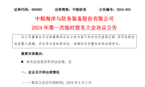 2月2日晚间,中船海洋与防务装备股份有限公司(中船防务)发布公告《2024年第一次临时股东大会决议公告》。 公告披露,董事会同意选举向辉明先...