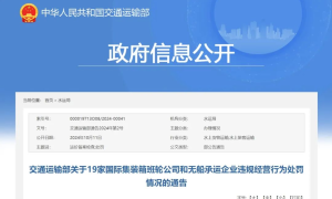 交通运输部消息,日前,交通运输部发布关于19家国际集装箱班轮公司和无船承运企业违规经营行为处罚情况的通告。 通告称,2023年7月,交通运输...