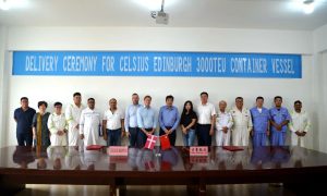 8月26日,蓬莱中柏京鲁船业有限公司为丹麦船东 CELSIUS SHIPPING建造的第三艘3000TEU集装箱船“CELSIUS EDIN...