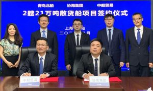 8月16日,中国船舶旗下中船贸易和武船集团北船重工作为联合卖方与浙江协海集团有限公司在上海和青岛两地以“云签约”的方式签署了2艘21万吨散货...