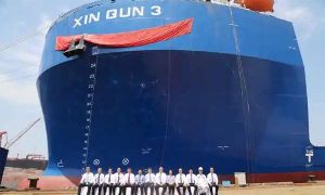 6月24日,青岛北海造船和中船贸易为信群集团建造的5万吨半潜船在公司造船二区举行命名仪式。 “XIN QUN 3”轮总长218.36米,型宽...