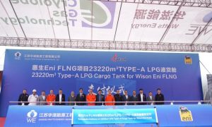 4月2日,华滋能源在启东基地举行惠生EniF445 MARINE XII OFFSHORE FLNG项目23220m³A型LPG液货舱交付仪...