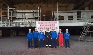 5月17日,外高桥海工为新加坡EPS项目船东建造的11.4万吨阿芙拉型成品油轮H1582船首制上建分段涂装项目正式开工。 H1582船是外高...