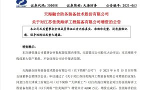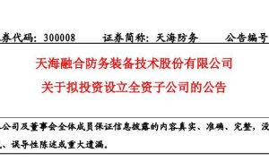 近日,天海融合防务装备技术股份有限公司发布公告,旗下子公司江苏大津重工有限公司为适应公司未来业务发展的需要,以自有资金投资 85 万元在泰州...