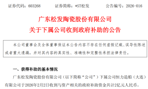 2月2日,恒力重工上市主体*ST松发公告称,下属公司恒力造船(大连)有限公司于2026年2月2日收到与资产相关的政府补助资金共计2亿元。 这...