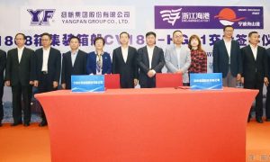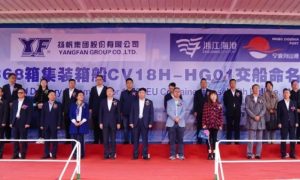 11月16日,扬帆集团舟山船厂为宁波远洋建造的1868标准箱首制船“新明州98”轮举行交船命名仪式,并签订《战略合作框架协议》。 1868T...