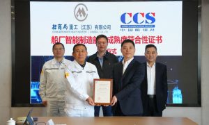 3月21日,中国船级社(CCS)副总裁赵晏率队到访招商工业海门基地并颁发了CCS首张《船厂智能制造能力成熟度符合性证书》。 双方围绕数字化技...