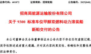9月17日下午,招商局能源运输股份有限公司(以下简称“招商轮船”)发布《关于 9300 标准车位甲醇双燃料动力滚装船新船交付的公告》。 公告...