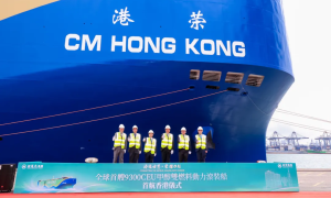 9月28日,全球首艘9300CEU(标准车位)甲醇双燃料动力滚装船“CM HONG KONG”轮(中文名“港荣”轮)首航香港仪式在香港青衣举...