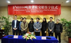 1月12日,新时代造船在八楼会议室举行签字交船仪式,5#64000吨散货船正式交付船东。
