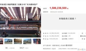 淘宝的司法拍卖平台显示,南通明德重工的首轮拍卖以流拍告终,拍卖时间从13日上午10点开始,至今天上午10点钟结束,期间有九千四百多人次围观。...