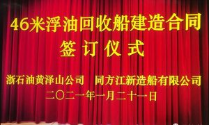 1月21日,同方江新与浙石油黄泽山公司顺利签订一艘46米浮油回收船建造合同,实现2021年经营订单首个“开门红”。 同方江新副总经理胡宪友与...