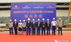 6月15日下午,泰州口岸船舶新区——泰州众航船舶为嵊泗浦盛海运建造的一艘62000DWT多用途重吊船(TK2202)举行吉水仪式。中波轮船股...