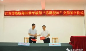 近日,泰州口岸船舶新区-泰州众航船舶为江苏苏港航务首次合作建造的一艘85米甲板船“苏港驳01”举行交船签字仪式。 该船总长85.00米,型宽...