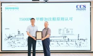 浙江欣海船舶设计研究院继2023年7月获得中国船级社(CCS)武汉规范研究所颁发的国内首张7500DWT甲醇加注船原则性认可(AIP)后,浙...
