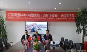 1月18日,江苏海通海洋工程装备有限公司为希腊船东Victoria Steamship建造的2号64000吨散货船“AFROS”号在公司码头...