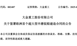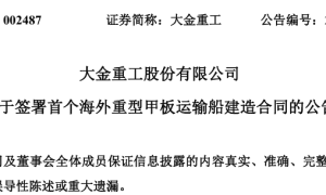 8月26日晚间,大金重工股份有限公司(以下简称“大金重工”)发布《关于签署首个海外重型甲板运输船建造合同的公告》。 公告披露,大金重工全资子...
