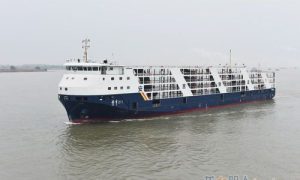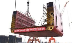 1月8日,镇江船厂为韩国船东建造的又一批3700DWT杂货船首制船顺利搭载。