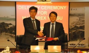 4月26日上午,江苏镇江船厂为韩国船东建造的特种专业运输船舶——11000DWT自卸运煤船“KOREX YEOSU”,比合同期提前5天签字交...