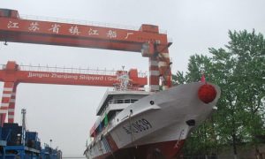 4月26日上午,江苏镇江船厂为江苏海事局建造的批量海巡船中的第二艘船顺利下水。