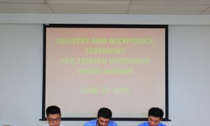6月29日,黄埔文冲公司双喜临门:公司为新加坡太古航运建造的2350TEU集装箱船“CHEFOO”轮(GWS460)在文冲厂区交付;公司为德...