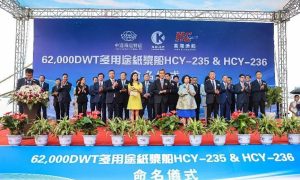 8月21日,黄海造船有限公司为海瀚洲际船务有限公司建造的两艘62000吨多用途纸浆船“中远海运吉祥”轮和“中远海运如意”轮举行命名仪式。 据...