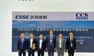 12月4日,在2025年中国国际海事展览会上,由中船集团武昌造船自主研发的29000DWT氨燃料双相不锈钢化学品船,成功获得中国船级社(CC...