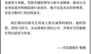 6月4日晚间,劳氏船级社通过其微信公众号发布讣告,宣告劳氏船级社大中华地区副总裁兼香港地区公司代表,资深验船师/高级工程师田斌于2025年5...