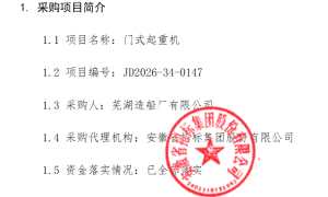 1. 采购项目简介 1.1 项目名称:门式起重机 1.2 项目编号:JD2026-34-0147 1.3 采购人:芜湖造船厂有限公司 1.4...