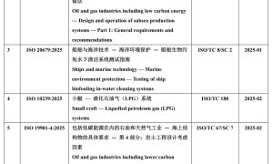 据统计,2025年度,在船舶与海洋领域ISO共发布25项国际标准,涉及自升式平台升降系统、船用配件、液化气等领域,详见下表。 2025年船海...