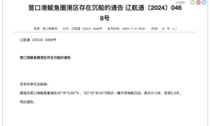 中国海事局网站消息,营口海事局11月21日发布航行通告,据报在营口港鲅鱼圈港区40°19′13.80″N ,122°05′18.00″E附近...